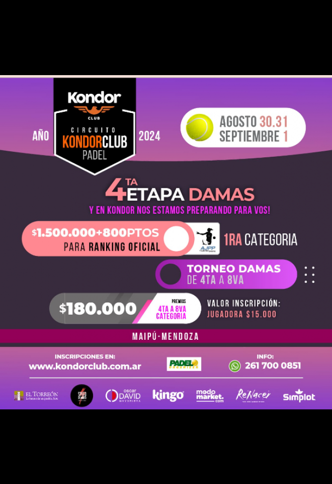 »» Evento: Circuito DAMAS - Kondor CLUB 2024 - Etapa 4 »» Localidad: Mendoza »» Fechas: 30/08/2024 al 01/09/2024