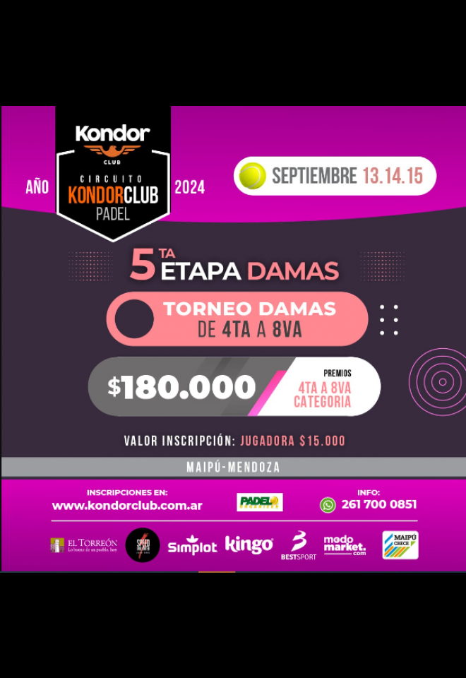 »» Evento: Circuito DAMAS - Kondor CLUB 2024 - Etapa 5 »» Localidad: Mendoza »» Fechas: 13/09/2024 al 15/09/2024