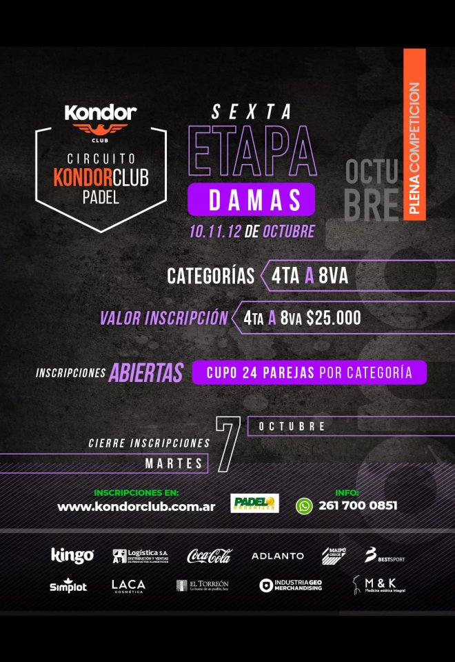 »» Evento: Etapa 6 - DAMAS KONDOR »» Localidad: Mendoza »» Fechas: 10/10/2025 al 12/10/2025